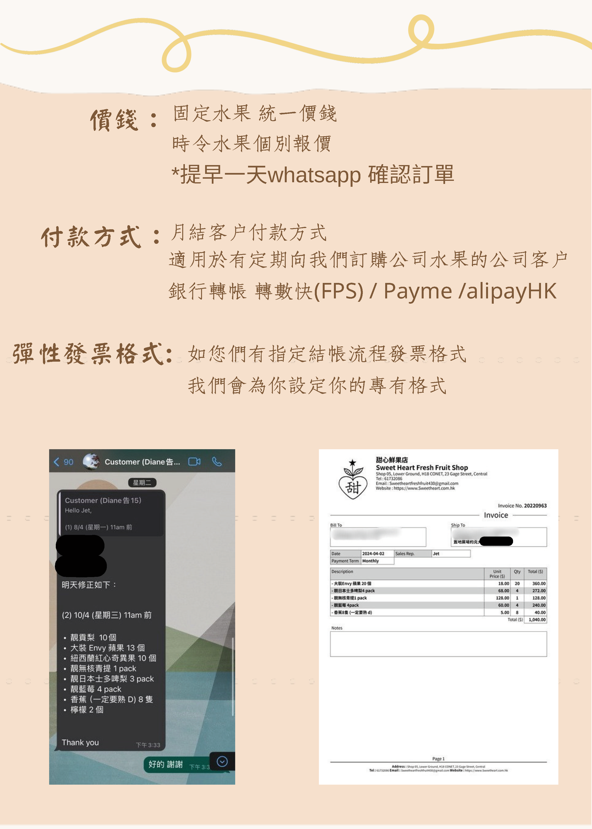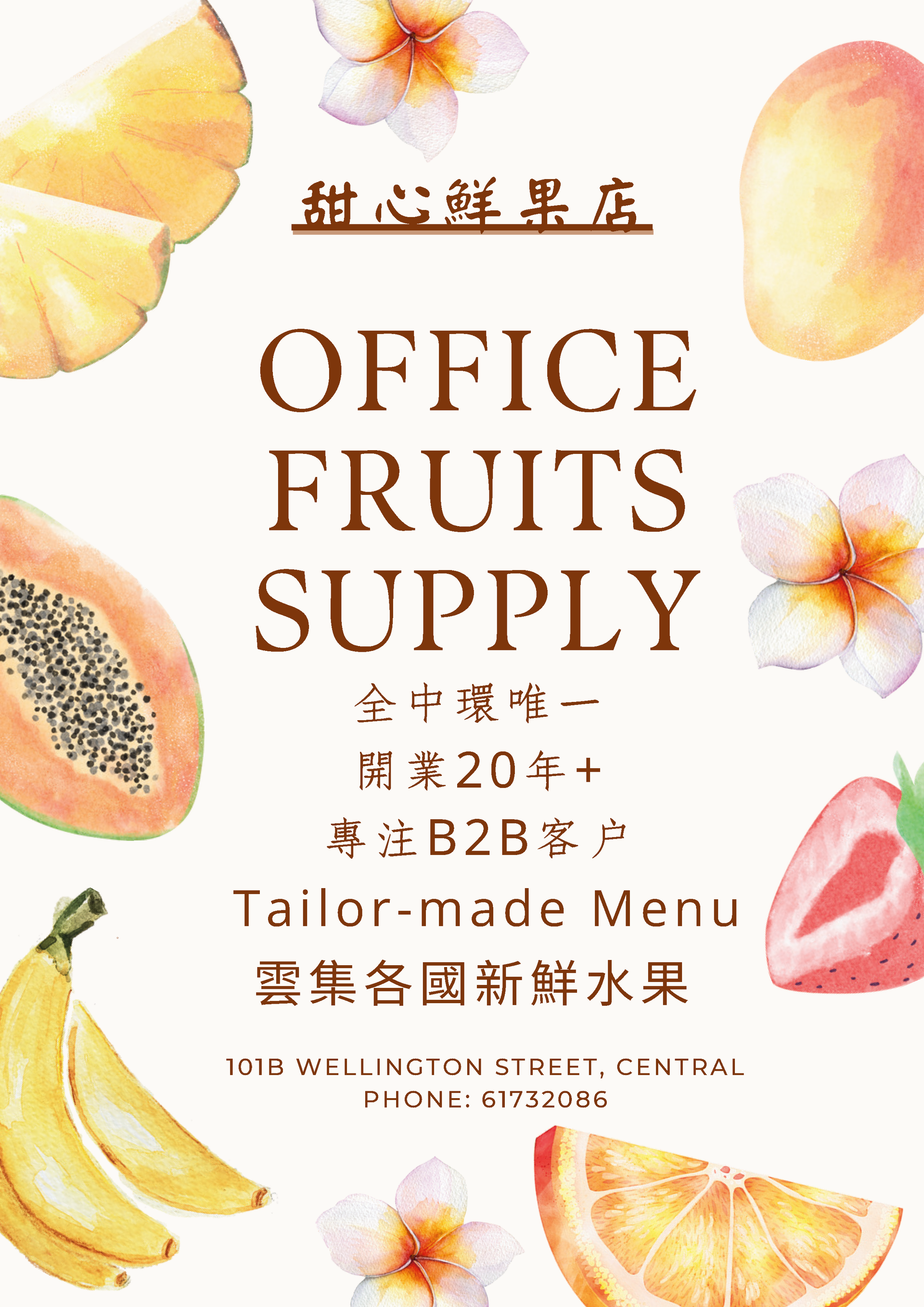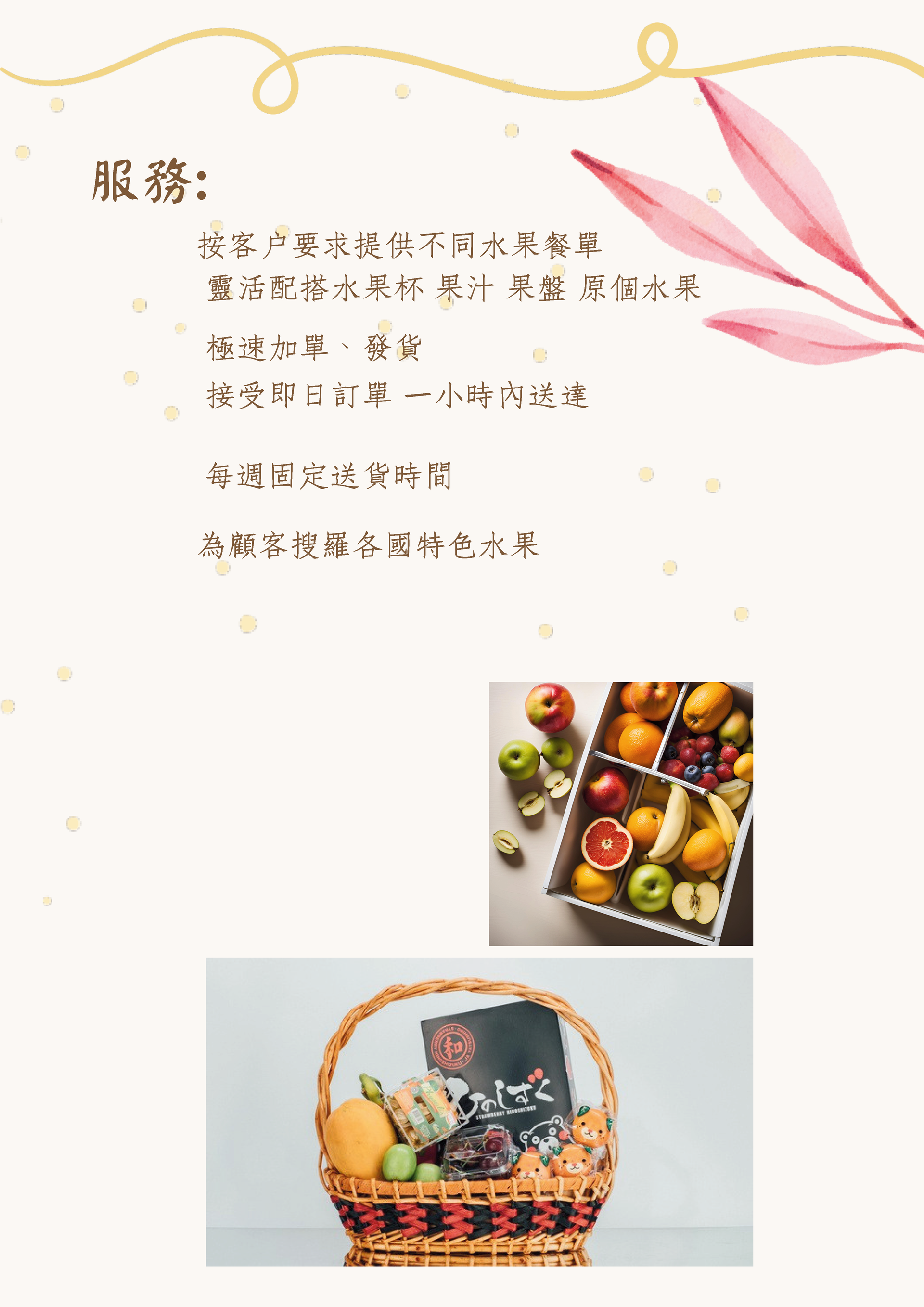 產品範圍涵蓋 果籃、花籃、果汁、果盤、水果杯、供應酒店、酒樓、酒吧、餐廳及會所時果、果汁等。