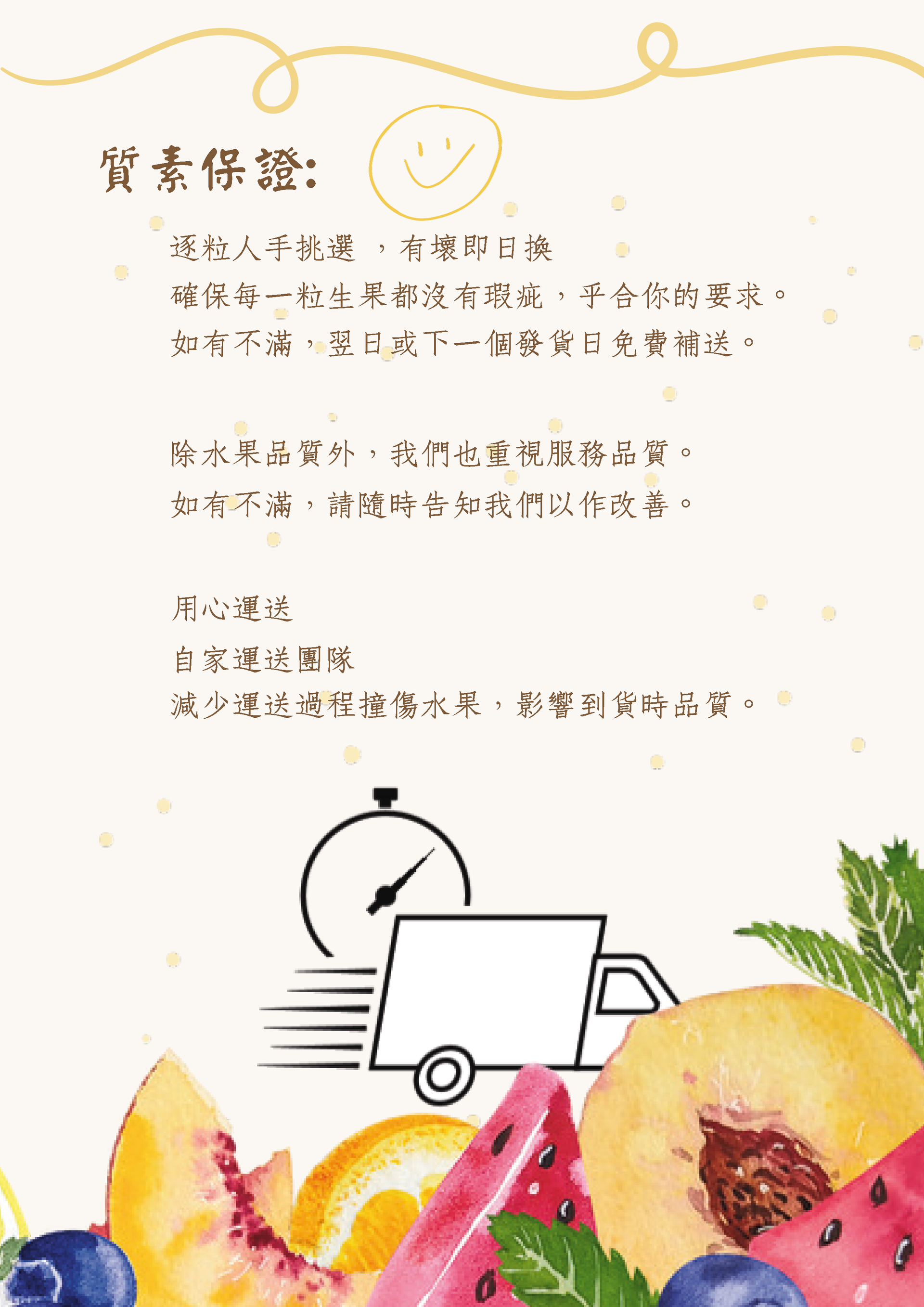 我們每週會根據公司客人提供的預算和訂購的水果數量提供水果報價,嚴格挑選最新鮮和最優質的水果,並將在客戶要求的時間將水果送到您的公司。